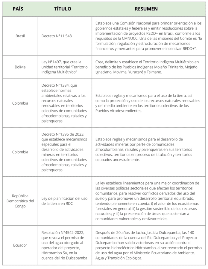 Explore con nosotros los desarrollos legales que durante 2023 dieron forma al discurso sobre los derechos de tenencia de la tierra y el agua de Pueblos Indígenas, Pueblos Afrodescendientes y comunidades locales, y modelaron las narrativas sobre conservación, cambio climático y derechos colectivos.
