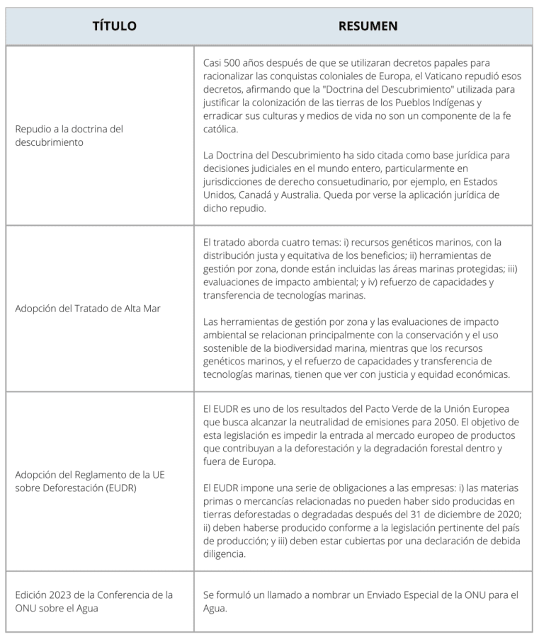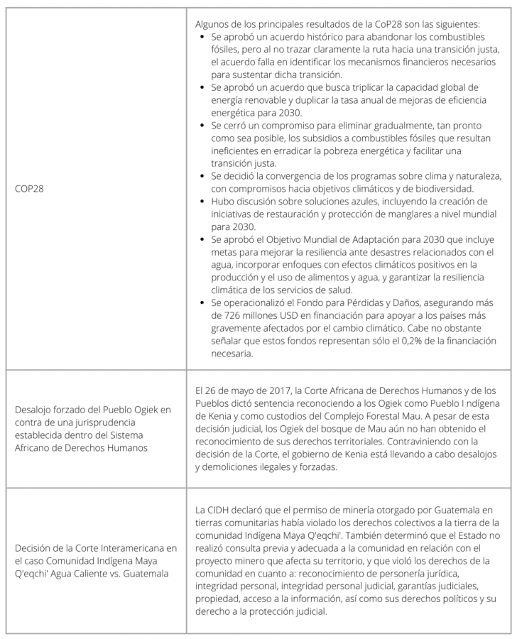 En el escenario internacional, RRI identificó en 2023 al menos 25 eventos o cambios jurídicos relevantes, que incluyen decisiones judiciales, decisiones cuasi-judiciales, informes, directrices, tratados, resoluciones y acciones relacionadas con la implementación. Estos son: