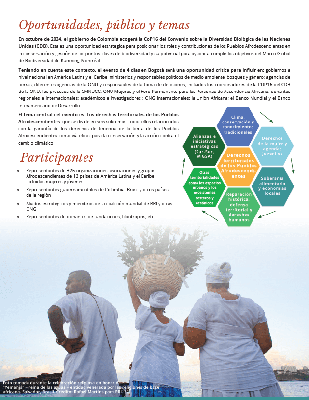 Este acontecimiento histórico, encabezado por la Iniciativa para los Derechos y Recursos y coorganizado por el Proceso de Comunidades Negras (PCN) de Colombia y la Coordinación Nacional por la Articulación de las Comunidades Negras Rurales Quilombolas (Coordenação Nacional de Articulação de Comunidades Negras Rurais Quilombolas) (CONAQ) de Brasil, en colaboración con la Vicepresidenta de Colombia, Francia Márquez, reunirá a representantes gubernamentales, organizaciones de la sociedad civil y ONG. Los objetivos son: