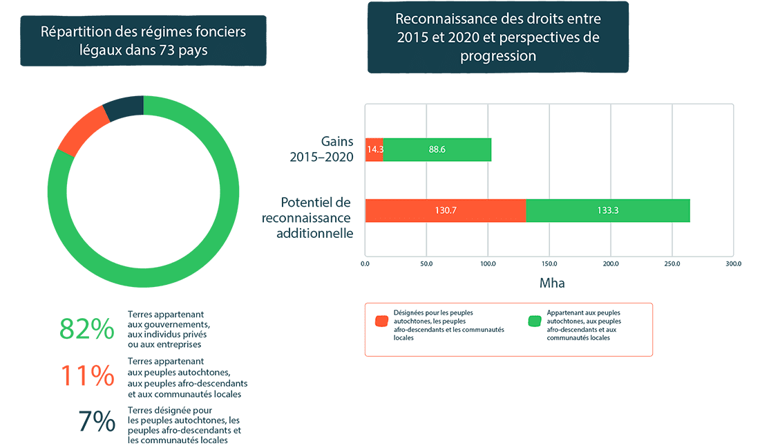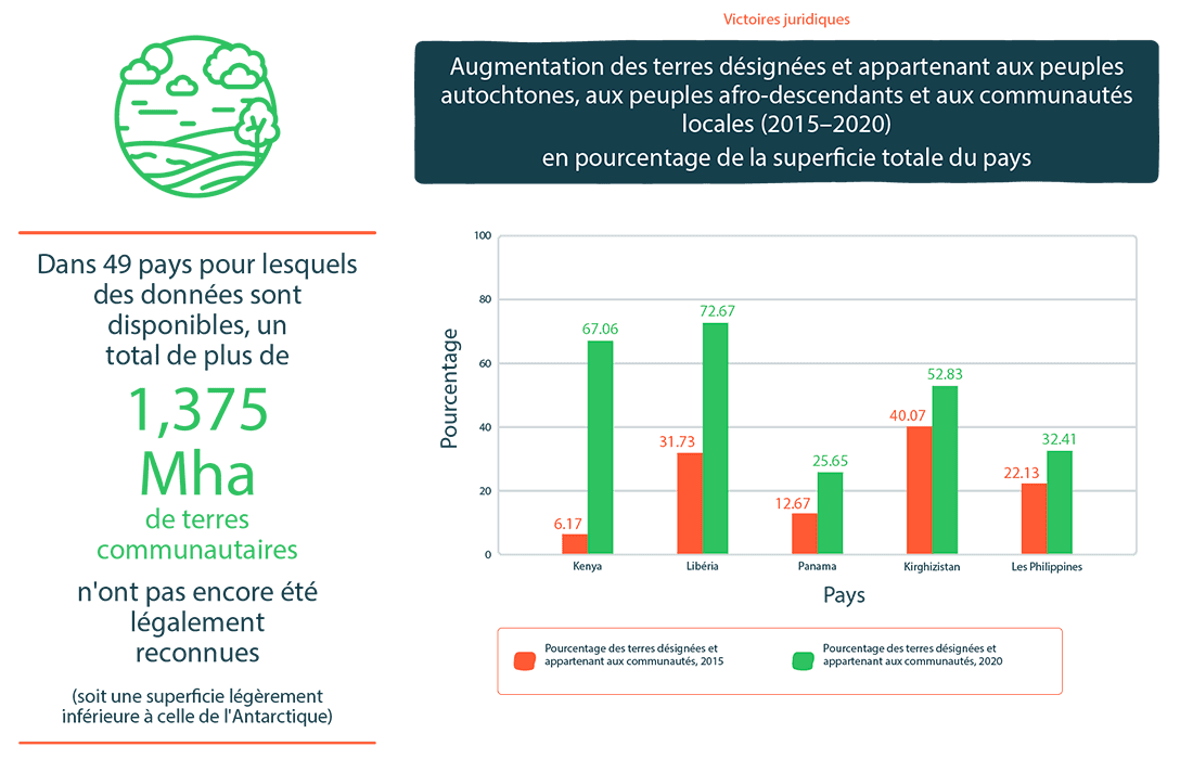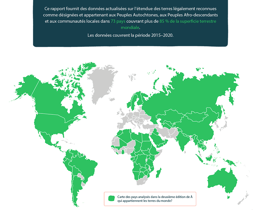 Les peuples autochtones, les peuples afro-descendants et les communautés locales représentent jusqu’à 2,5 milliards d’habitants de la planète et détiennent et utilisent de manière coutumière au moins 50 % de ses terres. Ce nouveau rapport de l’Initiative des droits et ressources (RRI) analyse les cadres juridiques de 73 pays couvrant 85 % de la surface terrestre de la planète et constate qu’au moins 39 gouvernements nationaux ont augmenté la superficie des terres appartenant aux peuples autochtones, aux peuples afro-descendants et aux communautés locales entre 2015 et 2020, ce qui s’est traduit par la reconnaissance juridique de plus de 100 millions d’hectares de terres communautaires.