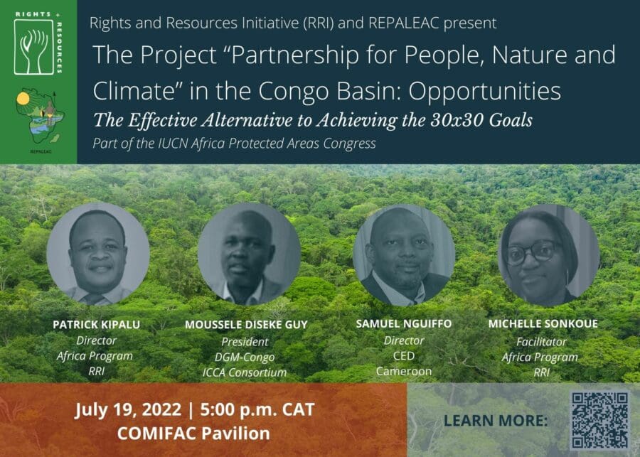 Organized by RRI and the Réseau des populations autochtones et locales pour la gestion durable des écosystèmes forestiers d’Afrique central (Network of Indigenous and local populations for the sustainable management of forest ecosystems in Central Africa—REPALEAC), this session presented the Partnership for People, Nature and Climate and explored opportunities of providing direct funding and organizational support to community conservation initiatives as well as to community land tenure struggles in the Democratic Republic of the Congo (DRC), the Republic of Congo (RoC), and Gabon. Read the speaker bios here.