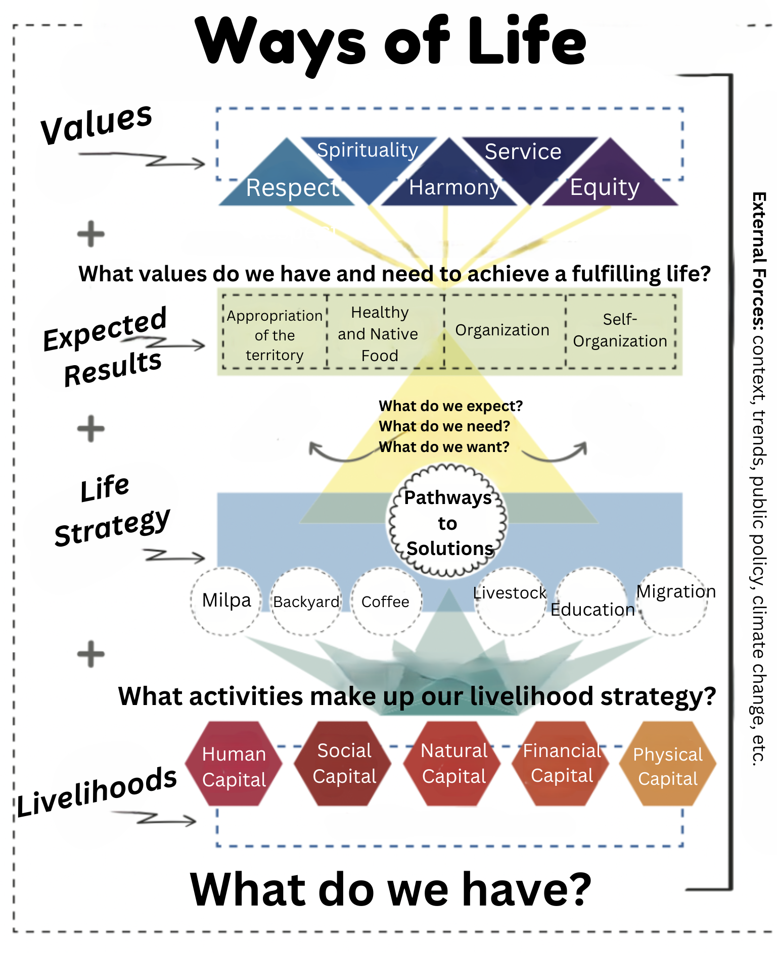 The manual ‘Livelihoods and Territorial Innovation for the Strengthening of Community Harmony’ from the College of the Southern Border in Chiapas, Mexico introduces the concept of “Ways of Life” as a values-driven approach to livelihoods. Ways of Life in this territorial framework is described as “everything that bears fruit around us knowing how to use what has life and what does not have life.”