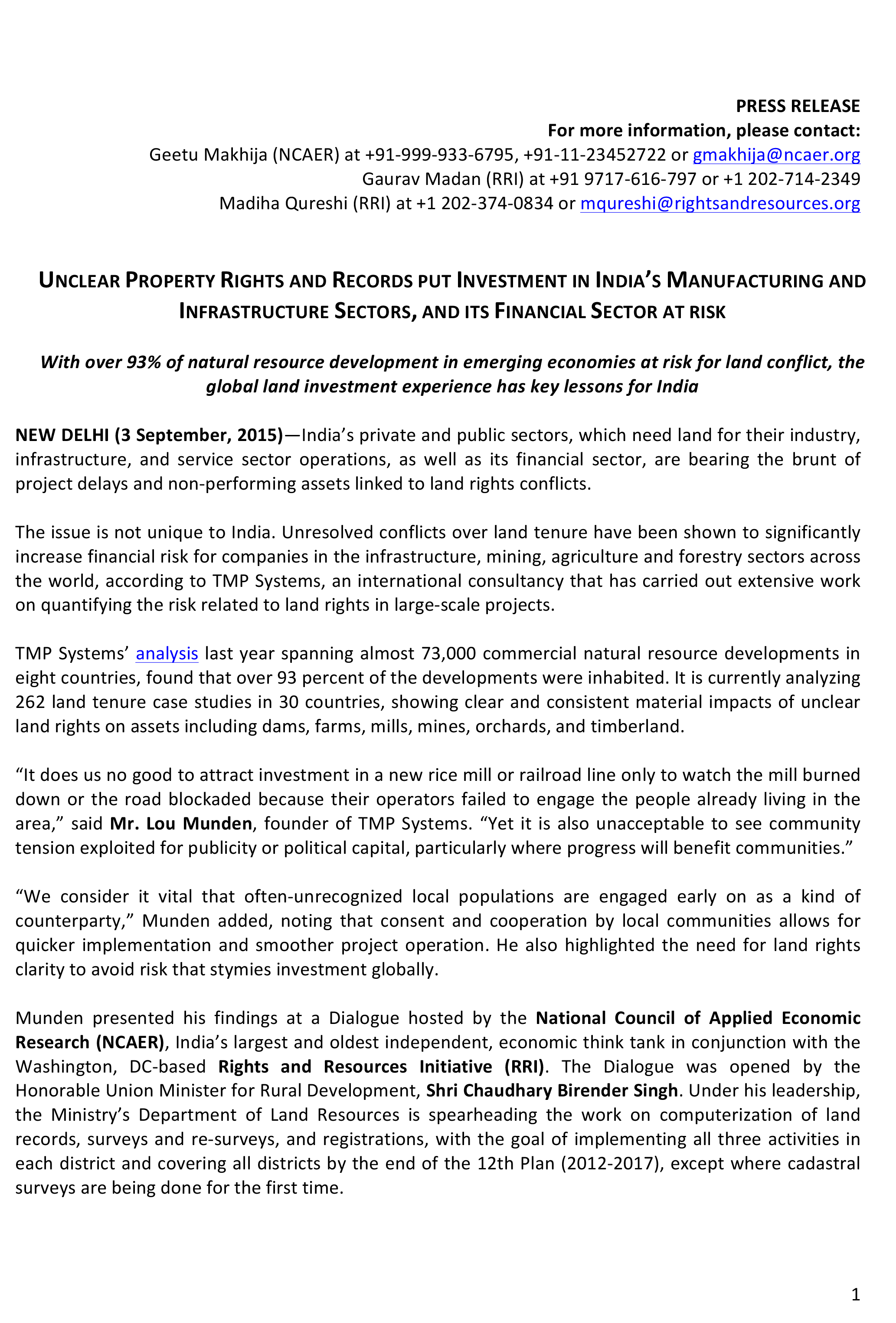 With over 93% of natural resource development in emerging economies at risk for land conflict, the global land investment experience has key lessons for India.