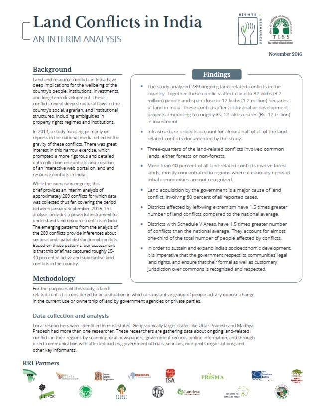 Land and resource conflicts in India have deep implications for the well-being of the country’s people, institutions, investments, and long-term development. These conflicts reveal deep structural flaws in the country’s social, agrarian, and institutional structures, including ambiguities in property rights regimes and institutions. In 2014, a study focusing primarily on reports in the national media reflected the gravity of these conflicts. There was great interest in this narrow exercise, which prompted a more rigorous and detailed data collection on conflicts and creation of an interactive web portal on land and resource conflicts in India.
