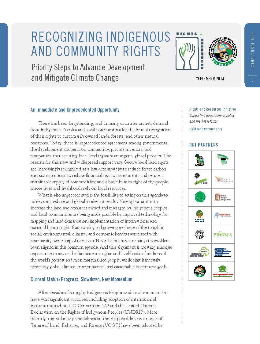 There has been longstanding, and in many countries unmet, demand from Indigenous Peoples and local communities for the formal recognition of their rights to customarily owned lands, forests, and other natural resources. Today, there is unprecedented agreement among governments, the development cooperation community, private investors, and companies, that securing local land rights is an urgent, global priority. This brief calculates the cost of securing Indigenous Peoples’ and community rights to the tropical forests where they live, noting that secure land tenure is a prerequisite for the success of climate, poverty reduction and ecosystem conservation initiatives.