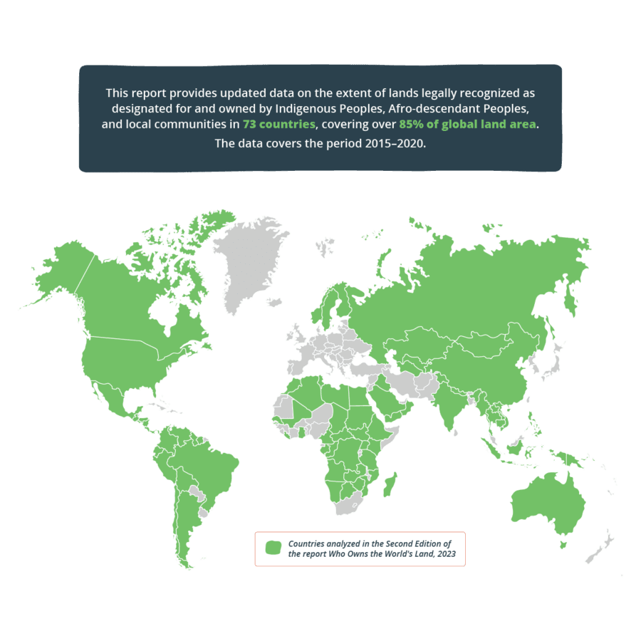 Since we published the first edition of Who Owns the World’s Land? in 2015, global acknowledgment of the importance of legally recognizing and securing the community-based land and resource tenure rights of the world’s 2.5 billion Indigenous Peoples, Afro-descendant Peoples, and local communities has reached unprecedented heights. Following decades of national and international advocacy by rightsholders and their allies, land tenure security for both communities and community women is now recognized as an integral component of the 2030 Agenda, without which the Sustainable Development Goals (SDGs), the Kunming-Montréal Global Biodiversity Framework, and the Paris Agreement objectives cannot be achieved. Moreover, mounting evidence concludes what Indigenous Peoples, Afro-descendant Peoples, and local communities have long maintained—that they are the best managers of their lands and resources.