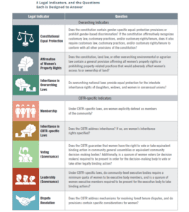 The analysis builds on RRI’s “bundle of rights” assessment of the strength and content of Indigenous Peoples’, Afro-descendants’, and local communities’ legally recognized forest rights in order to identify and track the specific statutory rights of women within 80 community-based tenure regimes (CBTRs). The methodology analyzes eight legal indicators essential for the protection of women’s forest tenure rights: